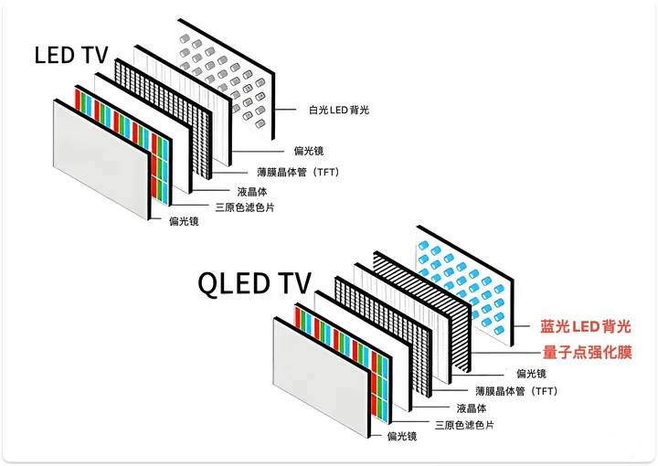 QLED(Quantum Dot Light Emitting Diode)是三星推出的量子點顯示技術。是在LED電視的基礎上增加了量子點膜層。