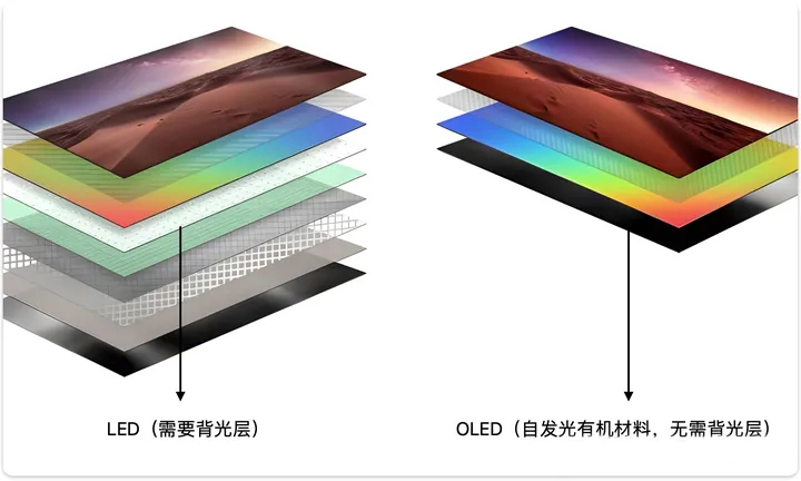 自發光:OLED屏幕的每個像素都可以獨立發光,提供非常優秀的對比度。